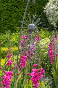 Informal borders filled with perennials are framed by striking yews. Other highlights include a winding woodland garden, a formal courtyard with elegant cloud trees, several garden sculptures and a large wildlife pond surrounded by vibrant planting.